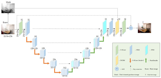 In order to improve the network’s focus on the haze regions, we designed the dark channel refinement module (DCRM), which integrated prior knowledge about the dark channel to guide and to refine the features learned by the network. The structural diagram of the DCRM is shown in Figure 5.