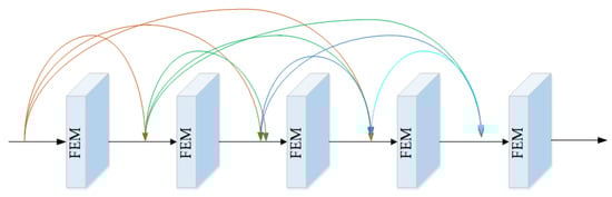 A multi-scale analysis is an effective technique to enhance the processing of image details and edge information while maintaining global consistency and improving image color preservation. In this paper, multi-scale information was attained using multiple downsampling and a cascaded FEM. We also employed deep feature extraction to improve the network’s dehazing performance. Furthermore, to prevent information loss during downsampling and feature extraction stages, we introduced a dense connection [18] structure to efficiently capture the richness of detailed and textural information in shallow feature maps, as depicted in Figure 3. This allowed us to fully leverage the information contained in these maps, which would have otherwise been lost during the downsampling process.