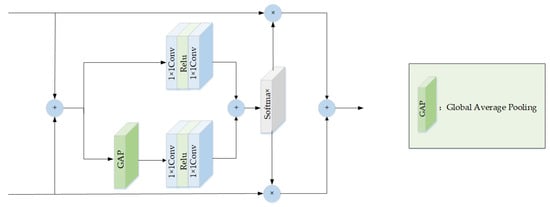 The residual feature x1 from the downsampling stage and feature x2 from the upsampling stage are added together to produce a fused feature x, which acts as the input for the global and local feature channels within the inner layer. On the one hand, the local feature channels mainly utilize a 1 × 1 convolution and a Relu function to acquire local attention. On the other hand, the global feature channels incorporate global attention by including global average pooling on top of the local feature channels. Afterwards, x1 and x2 are each multiplied by the weights that are generated from the Softmax function, and then the resulting features are combined through addition to obtain the fused output. The 1 × 1 convolution is utilized to reduce the dimensionality and to increase the computational efficiency of the network by minimizing the number of parameters.