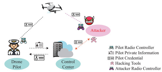 As drones deployed in the open environment carry sensitive information, many adversaries try to capture flying drones for malicious purposes. Compared with other electronic attacks, such as GPS spoofing attacks or Man-in-the-middle attacks, the adversary could launch an impersonation attack by utilizing the compromised credential, as illustrated in Figure 2. This paper assumes that all pilots and flying drones must first complete registration at the ground control center. After that, the pilot can utilize their credentials for mutual authentication at the beginning of the communication. Once their legal status is verified on the drone side, the pilot uses their remote radio controller to send instructions for the flying drone. On the other hand, the adversary tries to utilize hacking tools to capture the pilot’s credentials from the ground control center. Once the victim pilot’s credentials are obtained, it utilizes the compromised credentials to obtain the flying drone’s control privilege. As the knowledge-based authentication scheme can not verify the pilot’s legal status during the flight procedure, the adversary can impersonate the victim pilot and utilize their radio controller to send malicious instructions to the flying drone.