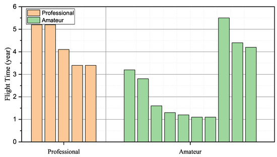 As the quadcopter has received wide attention due to its easy operation and broad application, we conducted experiments on the quadcopter, such as P450 and S500, to validate the effectiveness of the proposed identification scheme. In data collection, 15 students were required to fly quadcopters in the natural and constrained environment. Regarding P450, produced by AmovLab, it was installed with a depth of field and optical flow sensors to provide reliable flight performance for the drone. When it comes to S500, we constructed it from scratch under the guidance of the CUAV flight stack. We utilized the remote radio controller Futuba to capture the pilot instructions and send control signals to the flying drone. Among the invited pilots, five students from AeroModelling Team were required to act as professional pilots, and the remainder who came from our laboratory were the amateurs. Figure 4 details the participants’ operation proficiency, where we utilized the flying times to represent their operation experience.
