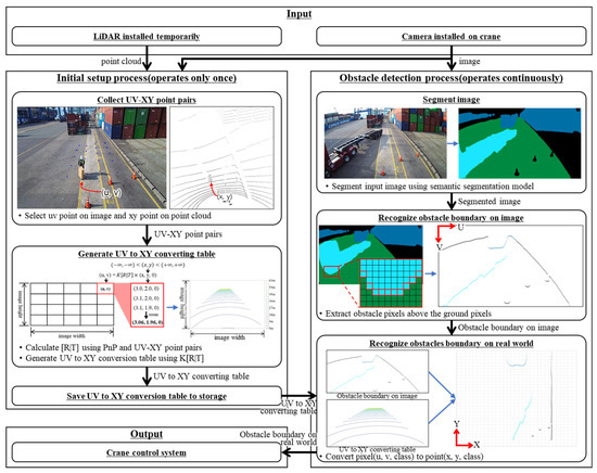 Figure 1 displays the process of the system for detecting obstacles around the transfer crane. This process consists of the initial setup process, which is executed only when the obstacle detection system is first installed on the crane, and the obstacle detection process, which runs when the crane is operated.