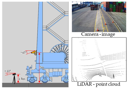 A camera and LiDAR were used to collect data for generating the training dataset and verifying the proposed method. For the camera, we used a camera that was already installed on the crane. LiDAR was installed using a tripod on the ground in front of the crane. For easy detection of vehicles approaching from a distance and to make a correction by recognizing the ground so that the ground and the XY-plane of the LiDAR coordinate system are parallel, LiDAR was installed facing the ground at approximately −10°. The specifications and installation information of the camera and LiDAR used in the experiment are presented in Table 1 and Figure 2.