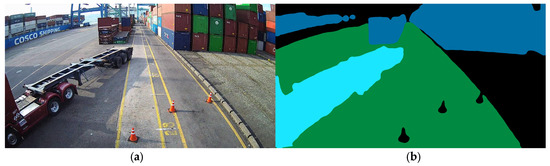 Generally, classes are assigned to almost all pixels of the training data for the semantic segmentation model. Unlike the training data of the object detection model, which represents the position of an obstacle with a bounding box, the outline of an obstacle should be depicted in detail in pixels. Various types of objects, such as containers, ships, trucks, cranes, people, and cars, exist in a port. However, labeling all objects existing in a port with class labels is time consuming. Therefore, to reduce the labeling time, the labeling classes were limited as follows. People, cars, trucks, and containers, obstacles often included in the training data, were labeled as separate classes. However, obstacles that are often included in the training data but are not of interest or obstacles that were infrequently included, such as sky, ships, unpaved ground, and cranes on another line, were labeled as misc. class. Furthermore, for the recognition of untrained obstacles on the ground, we labeled the paved ground where cranes and major obstacles move around, even though the paved ground is not an obstacle.