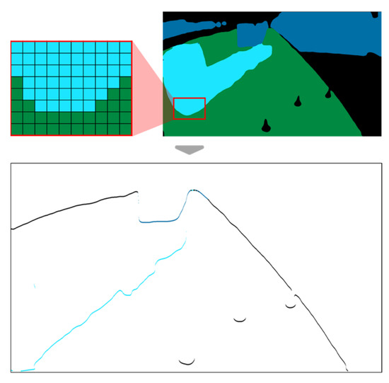 Given that all obstacles in the port are on the ground, the method of extracting the boundary of an obstacle from the semantic segmentation result by applying pixel filtering was as follows: The filter recognizes the pixel (u,v) being checked as the boundary of an obstacle if the pixel does not belong to the ground class, and the pixel below it (u, v + 1) belongs to the ground class. Figure 4 displays the result of extracting the boundary by applying the filter to the image in Figure 3b.
