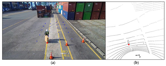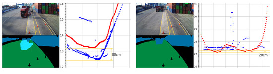 To validate the performance of the proposed method, we collected data as 10 trucks and 3 people passed by, then compared the error between the distances estimated by our method and those measured by LiDAR when the distance to the obstacles was approximately 5, 10, 15, 20, 25, and 30 m. For trucks, the error was 32 cm at 5 m and 125 cm at 30 m. For people, the error was 22 cm at 5 m and 30 cm at 15 m, and they were not recognized in the image by the semantic segmentation phase at distances greater than 20 m due to their small size. The distance-based estimation error for trucks and people is shown in Table 3. As for the container, it did not move during data collection, and so the verification was carried out only for one container positioned at a distance of 27.3 m, as shown in Figure 9b. The estimation error for the container was 20 cm.
