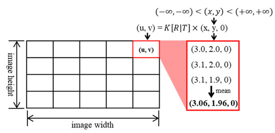 Step 2: Enter (x,y,0) coordinates of a sufficiently wide range in the matrix calculated using PnP to calculate (u,v) coordinates that correspond to the (x,y,0) coordinates entered. Next, store the (x,y,0) coordinates in the (u,v) components of the matrix created above.
