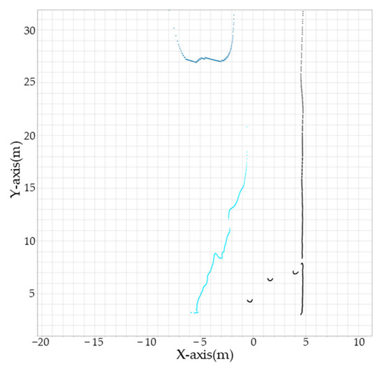 To calibrate the coordinate system so that the XY-plane of the LiDAR is parallel to the ground, we extracted only the points corresponding to the ground and calculated the plane equations. Then, we calculated a matrix to transform the plane to match the XY-plane of the LiDAR. The transformation matrix was applied to all points of the LiDAR point cloud data. After the calibration of the LiDAR coordinate system, points with a Z-value of 10 cm or less were removed from the point cloud data to filter only the points that corresponded to the box. The point with the smallest Y-value was automatically filtered from the remaining points, and the XY0 coordinates were selected, as indicated by the red circle in Figure 5b. The tasks were repeated to obtain 20 pairs of UV–XY0 coordinates located between 6 and 17 m in front of the crane. The obtained coordinate pairs are represented by the blue and red dots in Figure 5.