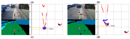 Comparison of the distance estimated by the camera and measured by the LiDAR. In the 2D point cloud images, red points are estimated using the camera and blue points are measured using the LiDAR. The obstacles are as follows: (a) truck (trained); (b) container (trained); (c) human (trained); (d) box (untrained).