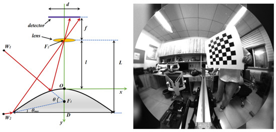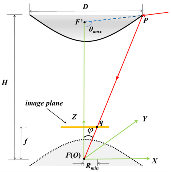 is the distance from the endpoint of the effective pixels on the short side of the image plane rectangle to the principal point of the optical axis, f is the focal length of the lens, is the camera FOV angle, a and b are the parameters of the hyperbola, and is the maximum vertical FOV angle of the system. The values of the quadratic surface reflection mirror parameters a and b can be obtained through Equations (1) and (2).
