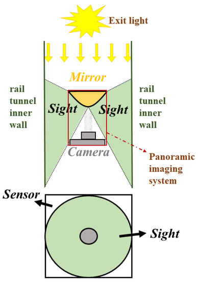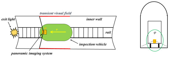 The scenario of this system is illustrated in Figure 4. The vehicle-mounted, high-dynamic-range panoramic inspection system is installed at the front of the inspection vehicle, and it performs short-exposure imaging of the cross section of the tunnel’s inner wall along the direction of the train’s forward movement. The horizontal FOV angle > 180°, and the vertical FOV angle = 360°, which can achieve the panoramic imaging of a large FOV for the tunnel.