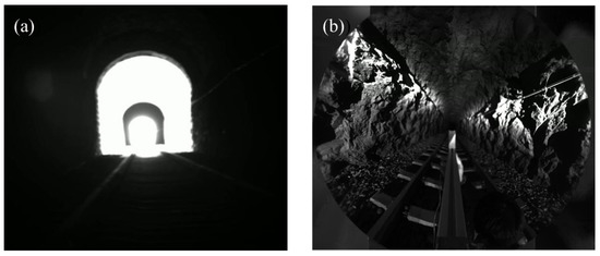 Actual scene of tunnel. (a) Tunnel image captured by a normal camera. (b) Tunnel image captured by our system.