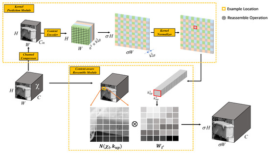 Consequently, we introduced a content-aware reassembly of features module [32] in the FPN structure to replace the original upsampling module. Compared with traditional upsampling methods, CARAFE has a larger receptive field, which can effectively aggregate contextual information in a large receptive field. It supports content-aware processing for specific instances and can dynamically generate adaptive kernels. Meanwhile, it demands fewer computation resources and is lightweight and easy to integrate. CARAFE consists of an upsampling kernel prediction module and a feature reassembly module as shown in Figure 7. The upsampling kernel prediction module includes three sub-modules: feature map channel compression, content encoder, and upsampling kernel normalizer. Feature map channel compression reduces the number of input feature map channels to using 1 × 1 convolution, which improves the efficiency of CARAFE and significantly reduces the required number of parameters. The content encoder generates a reassembly kernel based on the content of the input feature, which can produce a feature map with a channel number of , where represents the upsampling rate (usually 2) and represents the upsampling kernel size. To increase the encoder’s receptive field, we added convolution layers of the kernel size during processing to better utilize contextual information in the region. Finally, we normalized each channel of the upsampling kernel using the Softmax function. In the feature reassembly module, we mapped each position in the output feature map back to the input feature map, assumed the center × region and the predicted upsampling kernel for that region, and performed dot product operation to obtain the final output after upsampling.