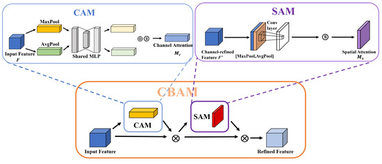 In panoramic images along the railway lines, there may be some low-resolution and blurry target objects. Using CBAM, attention regions can be extracted to help the model resist confusing information and focus on useful target objects. CBAM combines the channel attention module (CAM) and spatial attention module (SAM), making it a simple and effective lightweight attention mechanism that can be trained end to end as shown in Figure 8.