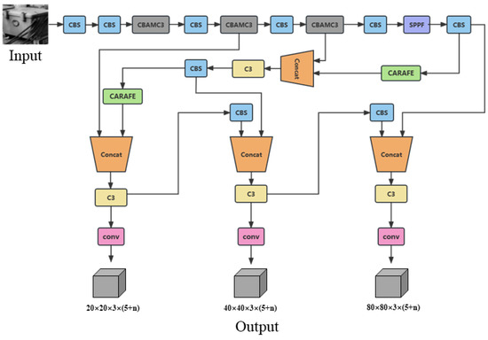 The overall proposed network architecture diagram is shown in Figure 10. Based on YOLOv5, we introduced the CARAFE module, incorporated the CBAM module into the C3 part of the backbone, and utilized the Focal-EIOU module to enhance the overall performance of the model. For ease of reference in subsequent experiments and discussions, we refer to this model as YOLOv5-CCFE (YOLOv5 + CARAFE + CBAM + FocalEIOU). When inputting an image or video for detection, the YOLOv5-CCFE model outputs three sets of anchor boxes with corresponding confidence scores at different scales. Non-maximum suppression is applied to these anchor boxes to determine the final position and category of the detected objects.
