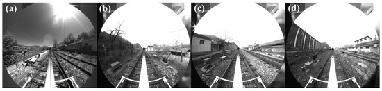 Images were collected using our assembled inspection test vehicle; owing to the specific characteristics of the experimental environment, the equipment inside the tunnel was limited. Therefore, the main focus of the image collection process was on the equipment around the railway line. Immediately, the model was verified; it could be directly applied to detect equipment inside the tunnel. Because the scene was relatively simple, the collection time was divided by season, including spring, summer, autumn, and winter (with different surrounding scenes), as well as different times of the day (with different light intensities) as shown in Figure 11. The collected data were labeled using Labelimg.