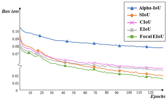 Figure 13 illustrates the impact of the five loss functions on the YOLOv5-CC algorithm. It can be observed that the regression box loss curve of the Focal-EIOU is the lowest, indicating that this loss has better regression accuracy and regression box loss compared to the other four loss functions.