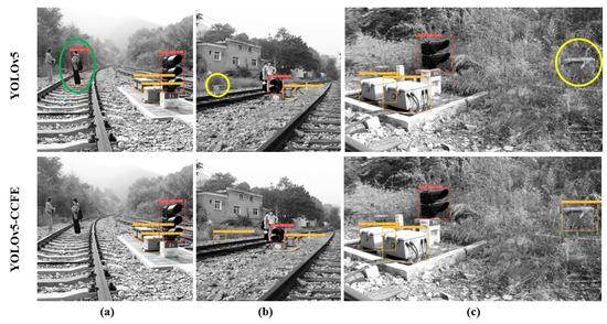 Image detection performance. (a) YOLOv5-CCFE figured out a false detection of a humanas a signal light of YOLOv5 in the green oval. (b) YOLOv5-CCFE detected a missed small track circuit equipment of YOLOv5 in the yellow circle. (c) YOLOv5-CCFE detected a missed track circuit equipment in the edge of YOLOv5 in the yellow circle.