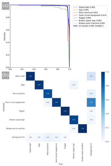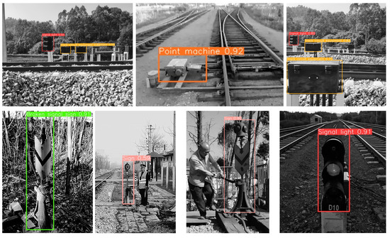As the image size collected was 2048 × 2448, it was uniformly downsampled to 640 × 640 when input into the YOLOv5 network, which can result in a loss of a large amount of detailed information. Moreover, the two side parts of the image are the equipment distribution area, and the upper and lower parts are invalid blank areas. To address this issue, we considered cropping the collected images to preserve the image in the effective area. The resolution of the cropped image is 992 × 992. To further enrich the dataset and improve its generalization ability, we implemented data augmentation techniques to increase the amount of data as shown in Figure 12. The main operations include flip, rotation, image sharpening, Gaussian blur, contrast change, occlusion by adding black blocks, and exposure change. Meanwhile, semi-automatic image annotation was used to synchronize the enhancement of images and annotations. In addition to the existing Mosaic data augmentation, the mixup data augmentation was added to the model in this study. This method enhances the mixed-class images by blending images from different classes, which is an augmentation strategy independent of the data. It improves the generalization ability of small samples with less computational cost and has good applicability. The dataset was divided into training, validation, and testing sets in a ratio of 7:2:1. In total, approximately 5600 images were included, and the detection objects included 7 categories, such as signal lights, electrical boxes, switch machines, and derailleur machines.