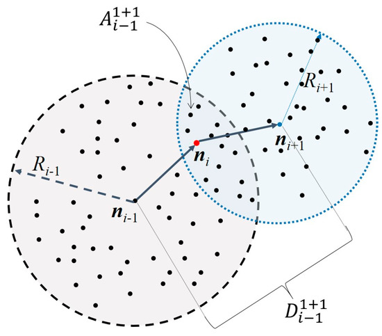 Consider a homogeneous scenario with randomly deployed nodes to obtain which is the area estimation of the intersection of B(Ri−1)B(Ri+1). The number N of nodes in an area A is distributed according to Poisson as , where stands for the node density (nodes per area) parameter, and for a given number N of nodes, the maximum probability occurs for [28]. Thus, for a known node density , the estimation of the area can be obtained from the number N of nodes in the intersection B(Ri−1) B(Ri+1).