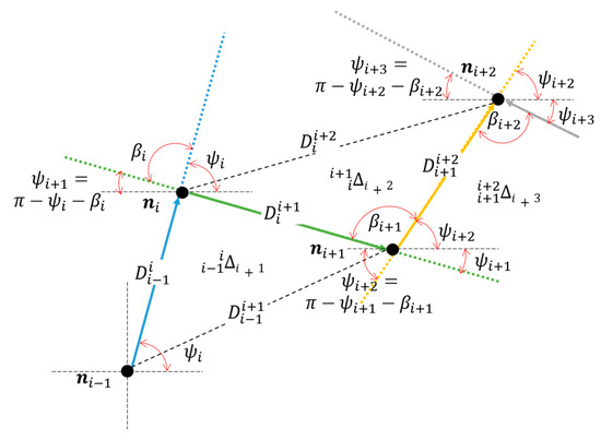 For instance, in a two-dimensional scenario, for the path segment ni−1,ni, ni+1, , and denote, respectively, the separation of consecutive nodes—ni−1,ni, and ni, ni+1—that can be estimated from the field strength or delay measurements. On the other hand, nodes ni−1, ni+1 are not adjacent, but their separation can be inferred from and, consequently, a triangle Δ(, ) = can be defined by its side lengths, and such a triangle contains a segment ni−1, ni, ni+1 of a dead reckoning path that links an anchor to a NoI. A similar process can be conducted for nodes ni, ni+1, and ni+2, and a triangle can be constructed. In addition, it can be seen that side is common to both triangles (see Figure 2).