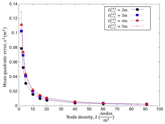 In Figure 5, we compare the localization error ε2 for different node densities λ = (2, 3, 5, 10, 15, 20, 40, 60 and 91) when RA = 3. Each curve represents the localization error ε2 at different separation distances , ranging between 2 and 5 m. It is possible to observe how the error increases as the separation distance grows when the density is low. In addition, the error decreases due to the node density λ increments, as these increments provide improvements in the intersection area. In Figure 6, we present the same results under a different perspective.