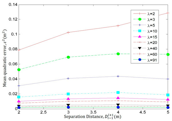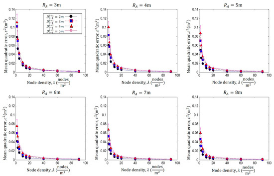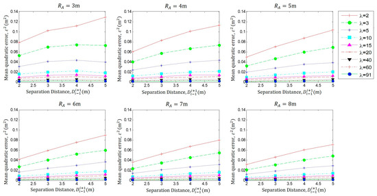 In Figure 6, the same analysis is realized for several coverage ranges of RA = 3 to 8 m, plotting the mean quadratic error vs. λ. In this figure, we can observe that each of the graphs presents the same analysis as that in Figure 4, i.e., the localization error ε2 increases as the separation distance is increased.