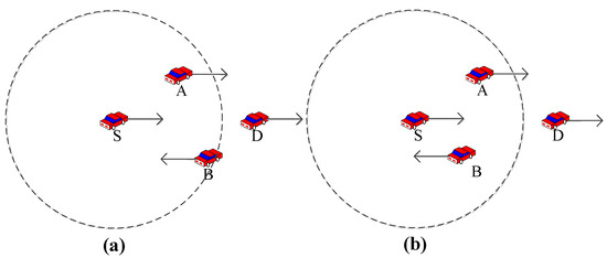 As shown in Figure 1a at T moment, the source node S sends a data packet to the destination node D. The direction of movement of node B is opposite to those of nodes S, A, and D. In the traditional greedy forwarding strategy, node B is closer; thus, node S selects node B for data transmission. However, as shown in Figure 1b at T + 1 moment, the node location changes, which will cause additional end-to-end delays, because node B will again select node A as the next hop node after receiving the packet. Therefore, when choosing the next hop node, not only does the distance need to be considered, but the direction of movement of the node also needs to be considered. Node S selects node A for data transmission, which will reduce the packet loss rate and average end-to-end delay.
