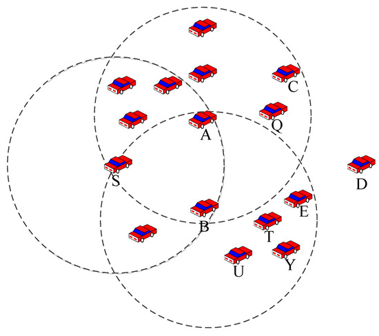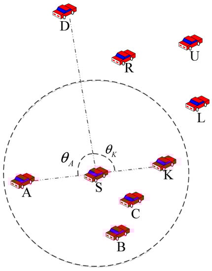 The cumulative communication duration defines the stability of the communication link between the neighbor node and the node currently carrying the data packet [15,16]. In Figure 2, nodes Q and C are in the reliable communication area of node A, and, thus, the cumulative communication duration between the two neighbor nodes and node S is calculated as follows: