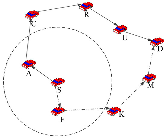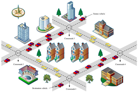 As the number of automobiles in the world continues to increase, countries around are also paying ever-more attention to traffic congestion and accidents. The intelligent transport system (ITS) proposed to effectively improve traffic efficiency plays an extremely important role in the mobility of today’s digital world [1]. VANET is a special kind of mobile ad hoc network (MANET), which is widely used in the transportation field and has become an important part of ITS [2,3]. With the rapid growth in network technology, computing power, and storage resources, VANET has become a network with continuous self-configuration and no infrastructure characteristics [4]. VANET can provide onboard services, such as information about traffic, road accidents, weather conditions, and general traffic warnings [5,6]. Vehicles that have encountered a road accident can broadcast news about this incident. Other vehicles can change their driving routes in advance to avoid possible traffic jams or other accidents, thereby improving the driving experience and safety. Each vehicle in VANET is equipped with an onboard unit (OBU), which is a built-in onboard network device that can share real-time traffic-related information with surrounding vehicles and distributed roadside units (RSU) [7]. The communication modes in VANET can be divided into vehicle-to-vehicle (V2V) and vehicle-to-infrastructure communication (V2I) [8,9]. Due to the cost of installing RSU, it is not feasible to use a large number of RSUs to provide the entire network connection. Reliable routing schemes can be used to improve the efficiency of data dissemination in a V2V environment.