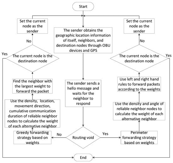 The process of the W-PAGPSR is shown in Figure 7. The sender or source node was first sent to obtain the location information of the neighbor node through the OBU device and GPS, before sending a HELLO message and waiting for the node to respond. The next step was to calculate the Euclidean distance from each neighbor node to the destination node in the communication range to determine the reliable neighbor node. We then checked for routing voids. If they were present, we used the weight-based perimeter forwarding strategy. If they were not present, we used the following steps: we calculated the angle between each neighbor and the destination node within the reliable communication range, the reliable node density of the neighbor, the cumulative communication duration between each neighbor, and the sender or source node, and, finally, calculated the weight of each candidate neighbor and selected the best relay node to deliver the message. In the perimeter forwarding strategy where the greedy forwarding strategy failed, the current node first calculated and compared the perimeter weight of the neighbor node, and then selected the neighbor node with the largest weight in the left and right half planes as the next hop to forward the packet. We executed Algorithm 1 when the data packet was transmitted.
