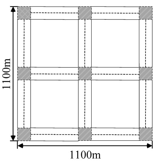 All simulations are based on NS-3.27. Using the Manhattan grid, as shown in Figure 8, the simulation area of m2 consists of 9 intersections and 12 two-way streets. We imported this data into SUMO to generate realistic movement trajectories. The initial position of the node obeys a random distribution, the movement of the node on the street is limited by the Krauss model, and the maximum speed of the node is 15 m/s. We generated several motion tracking files that were input into our NS3 module. Trace files were used in NS3 to generate different VANET communication scenarios. All vehicles had the same physical configurations. We implemented this approach using IEEE 802.11p MAC with a channel data rate of 3 Mb/s. The MAC layer did not have any QoS. The MAC layer used the TwoRayGround propagation model to measure the wireless signal fading characteristics.