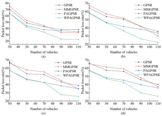 From Figure 9b, it can be seen that the packet loss rate of the four protocols at 70 nodes has increased. As shown in Figure 9b, the average packet loss rate of W-PAGPSR is 25.09%, 25.08%, and 15.87% lower than those of GPSR, MM-GPSR, and PA-GPSR, respectively. This result occurs because when the number of CBR connection pairs increases, the network load increases and a large number of nodes access similar links, increasing the chance of collision and interference between data packets, thus increasing the packet loss rate. When the number of nodes reaches 110, W-PAGPSR performance tends to stabilize because it balances the load between nodes in the network, which helps to make more efficient use of available bandwidth and, ultimately, deliver more data packets. As shown in Figure 9c, the average packet loss rate of W-PAGPSR is 22.98%, 244.08%, and 10.77% lower than those of GPSR, MM-GPSR, and PA-GPSR, respectively. As shown in Figure 9d, the average packet loss rate of W-PAGPSR is 25.14%, 26.53%, and 12.38% lower than those of GPSR, MM-GPSR, and PA-GPSR, respectively. Overall, the packet loss rate of W-PAGPSR in sparse scenarios is smaller than those of GPSR, MM-GPSR, and PA-GPSR. This result occurs because W-PAGPSR chooses the next hop with a more stable connection, a smaller distance to the destination, and better connectivity.