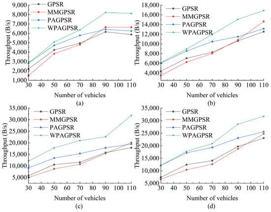 As shown in Figure 10a, the average throughput of W-PAGPSR is 29.61%, 36.70%, and 15.01% higher than those of GPSR, MM-GPSR, and PA-GPSR, respectively. Figure 10b shows that the average throughput of W-PAGPSR is 37.72%, 44.45%, and 16.05% higher than those of GPSR, MM-GPSR, and PA-GPSR, respectively. As shown in Figure 10c, the average throughput of W-PAGPSR is 75.89%, 89.33%, and 38.36% higher than those of GPSR, MM-GPSR, and PA-GPSR, respectively. Figure 10d shows that the average throughput of W-PAGPSR is 47.47%, 59.89%, and 11.89% higher than those of GPSR, MM-GPSR, and PA-GPSR, respectively. Since W-PAGPSR considers link quality and uses a weight model when selecting the next hop forwarding node, it shows better network resource utilization than other protocols.