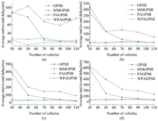 As shown in Figure 11a, the average end-to-end delay of W-PAGPSR is 34.04%, 74.18%, and 23.51% lower than those of GPSR, MM-GPSR, and PA-GPSR, respectively. Figure 11b shows that the average end-to-end delay of W-PAGPSR is 49.37%, 76.94%, and 18.57% lower than those of GPSR, MM-GPSR, and PA-GPSR, respectively. As shown in Figure 11c, the average end-to-end delay of W-PAGPSR is 52.35%, 82.89%, and 21.25% lower than those of GPSR, MM-GPSR, and PA-GPSR, respectively. Figure 11d shows the average end-to-end delay of W-PAGPSR is 48.33%, 79.96%, and 21.45% lower than those of GPSR, MM-GPSR, and PA-GPSR, respectively. By selecting the next hop with high reliability, W-PAGPSR has a lower end-to-end delay than GPSR, MM-GPSR, and PA-GPSR.