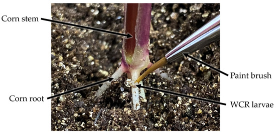 A total of 32 corn plants were prepared in the Lily greenhouse at Purdue University, West Lafayette, USA. Half of the plants were randomly assigned to the inoculated group, while the remaining plants were assigned to the control group. A total of 10,000 WCR eggs were ordered and incubated in a closed growth chamber at 27 degrees Celsius and 70% relative humidity to facilitate hatching. Most of the WCR eggs started to hatch when the corn plants reached the V2 growth stage. A total of 100 WCR larvae were delivered to the crown root section of every plant in the inoculated group using a miniature paint brush as shown in Figure 1.