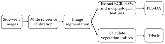 This project aimed at demonstrating that MISIRoot was capable of detecting the WCR damage to corn plant roots before symptoms of lodging or nutrient deficiency become visible in the shoot section. To achieve this, two different approaches were used to analyze the side-view RGB images of the corn plants. In the first approach, the color information and the morphological features of the plant leaves were extracted as the input of a Partial Least Squares-Discriminant Analysis (PLS-DA) modeling process, which would be able to tell if the two treatment groups could be well separated. The PLS-DA model was specifically selected because it has been extensively utilized in plant phenotyping applications to identify plant stress thanks to its exceptional ability to manage high-dimensional data and mitigate the issues of multicollinearity [19,20]. The second approach involved calculating various vegetation indices. The working flow for both approaches is illustrated in Figure 3 below.