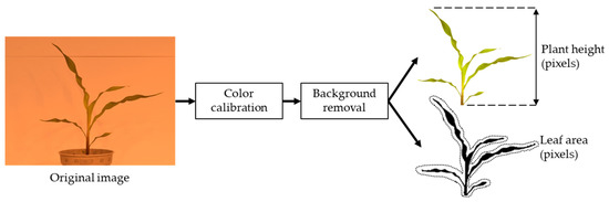 Before applying both approaches, the images were calibrated for ambient light variations using the white reference board positioned behind the corn plant. The corn plants were calibrated and segmented from the image to remove any ambient light and background noises. After segmentation, the average values for red (R), green (G), and blue (B) were extracted from the remaining pixels. To facilitate analysis, the RGB color space was then converted to the HSV (Hue, Saturation, Value) color space, which separates the brightness component (value) from the chromatic components (hue and saturation). The HSV color space is commonly used in machine vision and image processing applications, including plant phenotyping [21], as it enables the separation of brightness from color, making it particularly useful for analyzing images captured under varying lighting conditions. Moreover, as shown in Figure 4, two morphological features were extracted from the segmented images. The number of pixels remaining after segmentation was counted as an indicator to estimate the leaf area (biomass), and the height of the plants was assessed by calculating the distance between the top pixel and the bottom pixel.