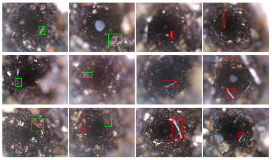 Examples of the CNN object detection model predictions using bounding boxes. Red bounding boxes meant thin roots. Green bounding boxes meant thick roots.