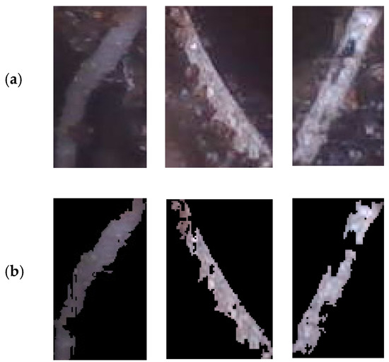 Example images of root segmentation. (a) Images before segmentation. (b) Images after segmentation by marking the background with black color.
