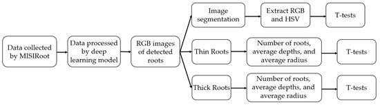 The average R, G, and B values, as well as the H, S, and V values of the remaining pixels from the segmented images were calculated and separated into two groups based on the thickness classification of the roots. t-tests were then conducted to ascertain the presence of any statistically significant differences between the two groups for each of these values. Further analysis was conducted on the classification of root thickness, as well as the coordinates of the detected roots The coordinates can be used to determine the depth, which is the distance below the surface, and radius, which is the distance from the plant’s main stem, for each identified root. The purpose of this analysis was to gain a better understanding of the distribution of roots and the extent of damage inflicted upon them. The working flow for analyzing the data collected by the MISIRoot system is illustrated in Figure 7 below.