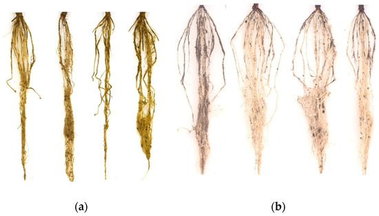 Example images of the extracted roots. Roots from the inoculated group are shown in (a). Roots from the control group are shown in (b).