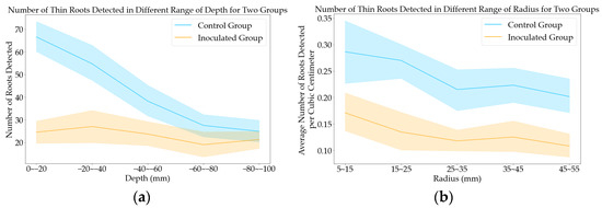 (a) The average number of detected thin roots across the depth for two groups. (b) The average number of detected thin roots across the radius for two groups. Figures (a,b) utilize blue and orange colors to represent the control and inoculated groups, respectively. The line indicates the average number of detected roots, while the shaded region represents one standard deviation above and below the mean.