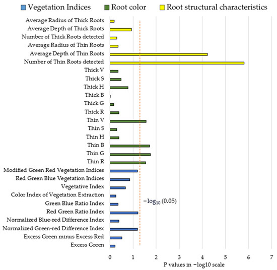 The results were compared to provide a more direct way of interpreting the differences between data collected by the DLSR camera from the shoot section and data collected by the MISIRoot. Figure 12 displays the comparison of p-values from all tests on a −log10 scale and the orange dashed line represents a p-value of 0.05. While none of the p-values for vegetation indices were smaller than 0.05, certain p-values for data collected by the MISIRoot system were found to be significant at this threshold. While color information for thin roots exhibits the capability to distinguish between the two groups, the average depth of thin roots and the number of thin roots detected yield the most promising results, as evidenced by the significant p-values of 6.0481 × 10−5 and 1.5791 × 10−6, respectively.