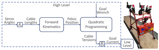 Illustrative Diagram for the mTPAD’s open-loop controller and the mTPAD system. maps the servo angle to the cable length for each motor. The pelvis position relative to the mTPAD frame is determined using forward kinematics, detailed in [22]. The pelvis position and the goal wrench are input to the quadratic programmer used to optimize cable tensions. maps the cable tensions to the servo currents. A low-level PID controller is implemented on the servo currents at the motor level.