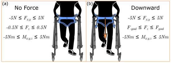 Forces applied to the pelvis and their associated quadratic programming wrench constraints. Here, z to the vertical axis. For the downward force, is limited within N from , which is 10%BW for each participant. Cable tensions created frontal plane pelvic forces, depicted by orange arrows, about the pelvic center. Tensions, represented by the blue arrows with the relative size reflecting the relative cable tensions, are applied by cables routed from motor subassemblies on the walker to the pelvic belt worn by the user. All seven cables are required to minimize all other forces and moments. While the illustration’s (a,b) demonstrate the Baseline holding condition, this is without loss of generalization, as the two force conditions are repeated using each arm condition. (a) depicts the constraining equations, and relative cable tensions for the No Force conditions, and (b) shows the constraining equations, relative cable tensions, and resultant force vector for the Downward conditions.