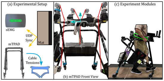 Experimental setup for the single session experiment evaluating effects of external forces and armrest position on the gait of adults without balance disorders: (a) The percentage of body weight based on the present condition is input to the mobile Tethered Pelvic Assist Device’s (mTPAD’s) open-loop controller, which outputs each cable’s optimized tension. These data were time synchronized with the instrumented mat and surface electromyography (sEMG) sensors via User Datagraph Protocol (UDP) packets; (b) The front view of the mTPAD illustrates the local coordinate frame used and the seven cables that route from the frame to the pelvic belt; (c) A participant walking overground in the mTPAD. In this frame, the participant holds the mTPAD frame, illustrating how participants walk in the Baseline condition. Each participant walked on an instrumented Zeno Walkway. The mTPAD’s pelvic belt is highlighted in green.