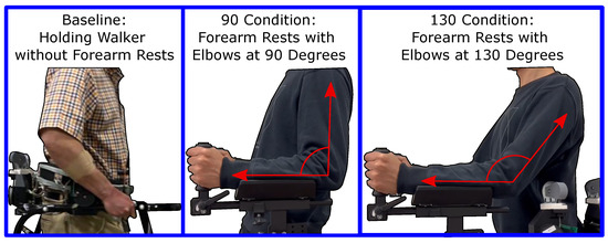 The experiment was completed by 11 healthy participants [age: 33.1 ± 17.8 years; height: 165.3 ± 9.0 cm; weight: 67.9 ± 12.1 kg; 6 Females, 5 Males]. The study was conducted in accordance with the Declaration of Helsinki, and approved by the Institutional Review Board of Columbia University protocol AAAT7862. Informed consent was obtained from all subjects involved in the study. The experimental protocol consisted of six conditions, and examples of the three arm configurations are shown in Figure 4. The three arm configurations are Baseline: holding the walker frame without using the forearm rests; 90: using the forearm attachments at a height such that the forearm and upper arm make a 90 angle; 130: utilizing the forearm attachment at a height such that the forearm and upper arm make a 130 angle. The full protocol consisted of (i) walking with hands holding the frame and no applied pelvic force, (ii) walking with hands holding the frame and a downward 10% body weight force applied, (iii) walking with arms on the armrests at a 90 angle and no applied pelvic force, (iv) walking with arms on the armrests at a 90 angle and a downward 10% body weight force applied, (v) walking with arms on the armrests at a 130 angle and no applied pelvic force, and (vi) walking with arms on the armrests at a 130 angle and a downward 10% body weight force applied.