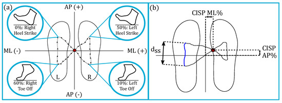 (a) The center of pressure (COP) cyclogram has toe-offs and heel strikes for the left and right feet. The x-axis represents mediolateral translation, and the y-axis represents anterior-posterior. The red dot in the center of the butterfly-shaped pattern is the cyclogram intersection point (CISP). (b) The definitions used for the cyclogram. The CISP mediolateral (ML) and anterior-posterior (AP) are the x and y coordinates of the CISP with respect to the symmetric center. The larger each value as a percentage, the more asymmetric the COP trajectory in that direction. The length of the blue arc, or the COP’s trajectory during single stance (SS), is the SS COP Distance. This distance (Dist.) normalized by each subject’s foot length is the SS COP Dist. %. The efficiency of the SS COP is calculated as the vector norm from each end of the arc divided by the SS COP Distance. Therefore, the straighter the SS COP trajectory, the higher the efficiency.