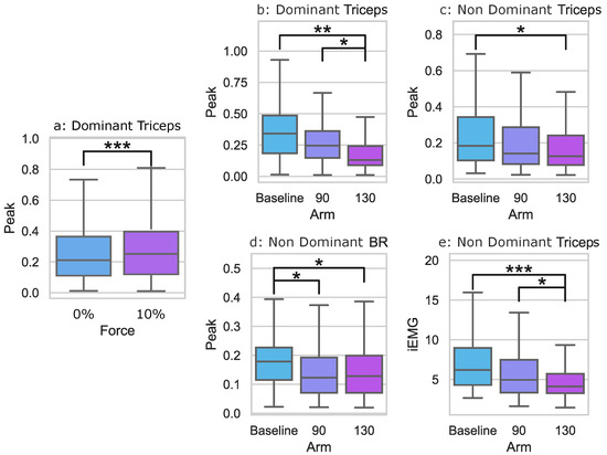 The mean and quartile ranges for the dominant triceps, non-dominant triceps, and non-dominant brachioradialis with respect to either 0% force and 10% force or Baseline, 90, and 130 arm-holding positions: (a) The dominant triceps peak values for the conditions with and without applied force; (b) The dominant triceps peak values for the arm conditions Baseline, 90, and 130; (c) The non-dominant triceps peak values for the arm conditions Baseline, 90, and 130; (d) The non-dominant brachioradialis peak values for the arm conditions Baseline, 90, and 130; (e) The non-dominant triceps integrated sEMG (iEMG) values for the arm conditions Baseline, 90, and 130. The following notation is used for statistical comparisons: *: ; **: ; and ***: .